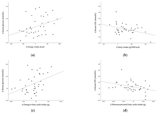 (a) Correlation between Δ energy intake and Δ serum glucose; (b) correlation between Δ dairy intake and Δ serum LDL; (c) correlation between Δ omega-6 fatty acids intake and Δ serum glucose; (d) correlation between Δ monounsaturated fatty acids intake and Δ serum LDL; Δ—change of post-lockdown value from baseline.