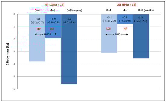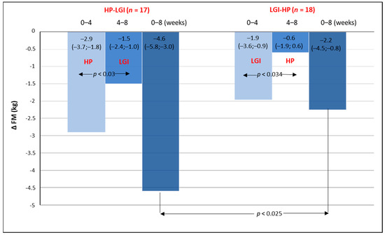 A significant reduction in fat mass was observed in all participants. In both groups, the fat mass reduction was significantly greater during the first 4 weeks compared with the subsequent 4 weeks of the study (Figure 3). After 8 weeks of the intervention, the reduction of fat mass in the HP-LGI group was significantly greater compared with that in the LGI-HP group: 4.6 kg (5.8; 3.0 kg) vs. 2.2 (4.5; 0.8); p < 0.025.