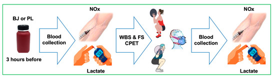 In sessions 3 and 4, resistance exercise tests were executed for the comparison of the two experimental conditions (BJ and the PL). For this purpose, two weightlifting exercises were selected: wall ball shots (WBS) and a FS. The resistance exercise test consisted of repeating the same routine twice. The first routine consisted of 90 s of WBS plus 60 s of FS with a 3 min rest between both exercises. The second routine consisted of WBS for 90 s plus FS for 60 s without a rest between the two exercises. A 3 min rest was applied between both routines. The same routine with and without a rest was selected to demonstrate the possible ergogenic effect of NOx during a rest under more aerobic conditions. We previously demonstrated that BJ increased performance to a greater extent than a placebo when a rest was established between exercises. Without a rest between exercises, the anaerobic conditions of the routine increased and there was no ergogenic effect of BJ [34].