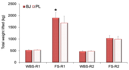 For the total weight lifted, a significant interaction effect was verified (F(4,40) = 10.30, p < 0.001, ηp2 = 0.51, SP = 0.99). Significant effects were found in the time (F(4,40) = 119.42, p < 0.001, ηp2 = 0.92, SP = 1.00) and the experimental condition (F(1,10) = 14.00, p = 0.004, ηp2 = 0.58, SP = 0.92). A Bonferroni test confirmed a higher weight lifted in the FS exercise after BJ intake than in the PL during the first routine (p = 0.004). No significant differences were found in the total weight lifted between the two experimental conditions in the second routine in the FS and WBS exercises (p > 0.05) (Figure 2).