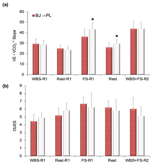 In this anaerobic environment, it was expected that there would be an elevated VE•VCO2−1 slope in response to adequate VE and poor perfusion (VE/perfusion mismatching). Compared with other studies, the mean values of the VE•VCO2−1 slope (BJ, 31.9; PL, 33.8) and the OUES (BJ, 5.7; PL, 5.6) were worsened in our athletes than in highly trained athletes (VE•VCO2−1 slope, ~28; OUES, 3.8) [2] and than in healthy people (VE•VCO2−1 slope ~19 to 30; OUES, ~2.6) [8,51,52]. The values of the VE•VCO2−1 slope exceeding 34 have been used as a reference to determine ventilatory impairment in diseases [53,54] or to indicate an inefficiency of the respiratory system [51]. The VE•VCO2−1 slope was worsened in the FS exercise during the first routine (BJ = 36, PL = 43.3) and the second routine (BJ, 43.7; PL, 43.9) as the anaerobic environment was raised (Figure 3). The obvious difference in the VE•VCO2−1 slope between the two experimental conditions was produced in the FS exercise during the first routine and in the subsequent recovery time. Theoretically, VE/perfusion mismatching was aggravated in the PL group during the FS exercise (first routine), coinciding with a decrease in weightlifting performance.