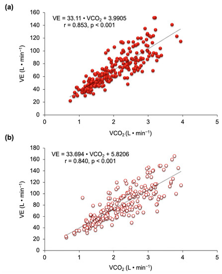 In the VE•VCO2−12 slope, VE and VCO2 were highly correlated (p < 0.001) in the two experimental conditions (Figure 4).