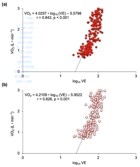 Similarly, high correlations (p < 0.001) were found between VO2 and log10 VE in the OUES in the two experimental conditions (Figure 5).
