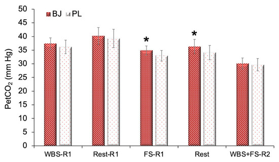For the PetCO2, a significant interaction effect was found (F(4,40) = 3.79, p = 0.01, ηp2 = 0.28, SP = 0.85). Time and experimental condition effects were detected (F(4,40) = 58.58, p < 0.001, ηp2 = 0.85, SP = 1.00; F(1,10) = 25.01, p < 0.001, ηp2 = 0.71, SP = 0.99, respectively). A Bonferroni adjustment corroborated that BJ increased the PetCO2 during the FS in the first routine (p < 0.001) and at rest between the first and the second routine (p < 0.001) (Figure 6).