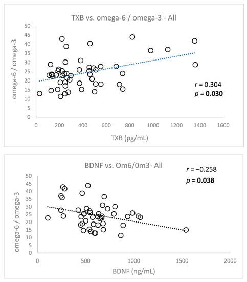 | omega-6/omega-3 vs. BDNF | 52 | −0.258 | 0.038 |