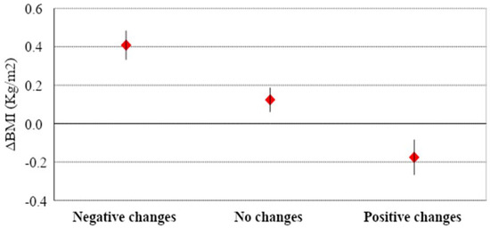 In the three classes of change, mean (± SD) BMI value did not differ significantly (“negative change”: 23.34 ± 4.19; “no change” 23.23 ± 4.15; “positive change” 23.09 ± 4.01, p = 0.737). On the contrary, mean (± SD) ΔBMI differed significantly (p < 0.001) between subjects in the “negative change” class (0.4 ± 10.8), subjects in the “no change” class (0.12 ± 0.74), and subjects in the “positive change” class (−0.18 ± 0.9), as reported in Figure 1.