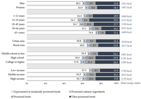 The dietary energy intake and energy contribution of the four NOVA food groups according to socioeconomic characteristics is shown in Figure 1. In all socioeconomic subgroups, more than half of the total energy intake came from unprocessed or minimally processed foods, followed by ultra-processed foods, processed foods, and processed culinary foods. Although there were differences in degrees, such a tendency was found consistently in all groups.