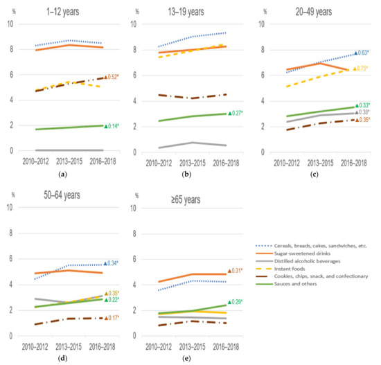 Time trends in the dietary energy contribution of ultra-processed foods’ subgroups by age group (KNHANES from 2010 to 2018. (a) Children aged 1–12 years, (b) adolescents aged 13–19 years, (c) adults aged 20–49 years, (d) adults aged 50–64 years, and (e) elders aged 65 years or older. “▲number*” means a statistically significant increasing change per cycle at p < 0.05 for adjusted linear trend tests. In the analyses, sex, residence area, education, and household income level were adjusted.