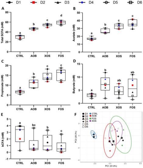 Changes in (A) total SCFA, (B) acetate, (C) propionate, (D) butyrate, (E) BCFA, and (F) PCA of metabolic markers after short-term fecal batch incubations (48 h) for six donors, upon treatment with AOB, XOS and FOS versus a blank control. In the PCA, ellipses indicate a confidence interval of 95%. The selected donors are marked with thick, black lines. CTRL= control; AOB = antioxidant blend; XOS = xylooligosaccharides; FOS = fructooligosaccharides; D = donor; BCFA = branched-chain fatty acids; SCFA = short-chain fatty acids. Significant differences are indicated with different letters (a, b, c, d; p < 0.05).