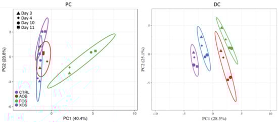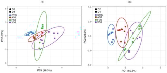 Principle component analysis plots for (left) PC and (right) DC long-term SHIME samples, representing metabolic data (acetate, propionate, butyrate, BCFA, total SCFA and lactate) obtained on four different time points (days 3/4/10/11 of treatment) for blank control, AOB, XOS and FOS for two donors (D2 and D4). Ellipses indicate a confidence interval of 95%. PC = proximal colon; DC = distal colon; CTRL = control; AOB = antioxidant blend; XOS = xylooligosaccharides; FOS = fructooligosaccharides; D = donor; BCFA = branched-chain fatty acids; SCFA = short-chain fatty acids.