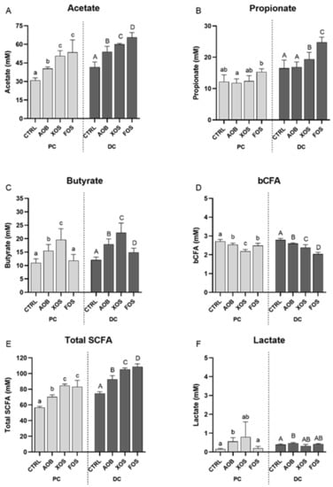 Changes in (A) acetate, (B) propionate, (C) butyrate, (D) BCFA and (E) total SCFA, and (F) lactate for donor 2, upon treatment with AOB, XOS and FOS versus a blank control for PC and DC. Bars represent the average and standard deviation of four treatment days (D3/4/10/11) (n = 4). CTRL = control; AOB = antioxidant blend; XOS = xylooligosaccharides; FOS = fructooligosaccharides; PC = proximal colon; DC = distal colon; BCFA = branched-chain fatty acids; SCFA = short-chain fatty acids. Significant differences are indicated with different letters (a, b, c, A, B, C, D; p < 0.05).