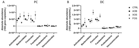 FOS treatment induced a significant increase of Bacteroidetes and Firmicutes phyla in the DC region when compared with the control. Fusobacteria levels were significantly lower upon AOB treatment (Figure 6).