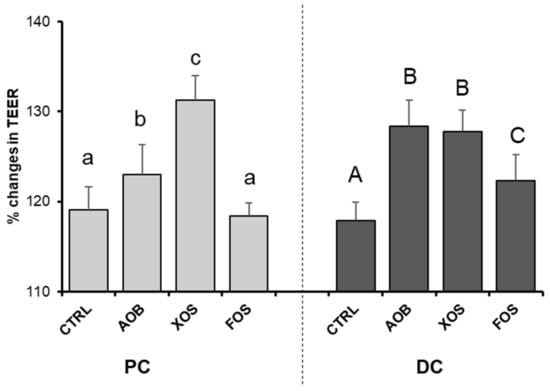 AOB and XOS increased TEER significantly in the PC, while all treatments increased TEER in the DC when compared with the blank control (Figure 7). Increases in TEER were most pronounced for XOS in the PC and for both AOB and XOS in the DC.