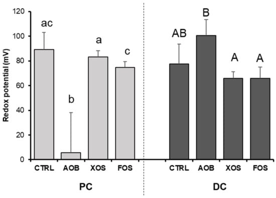 AOB significantly decreased redox potential compared with the blank control as well as with XOS and FOS treatment in the PC (Figure 8). There were no differences in redox potential between the tested products compared with the blank control in the DC.