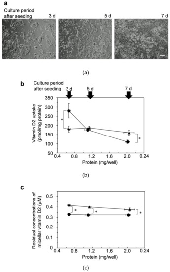 In addition to evaluations in dispersed cells, we evaluated the uptake of vitamin D2 in cells with insufficient cell-cell adhesion. The cells were cultured for 3, 5, and 7 d after seeding into 24-well plates and then incubated with vitamin D2 solubilized in mixed micelles.