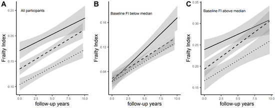 3.3. Association of the Mediterranean-Type Diet with the Trajectory of FI by Baseline FI