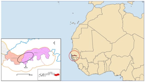 Figure 1. Study catchment area (circled in black) in the Upper River Region (red inset) of the Gambia (circled in red) in West Africa (main picture).