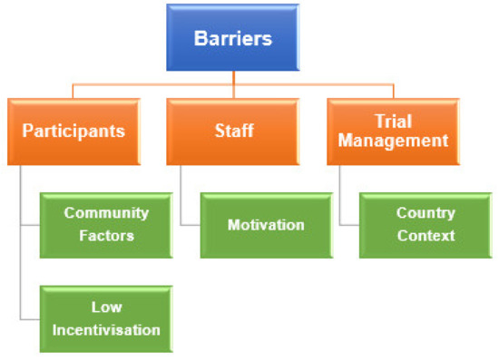 The barriers included community factors and low incentivisation (participant level), motivation (staff level), and country context (trial management level) (Figure 2). Illustrative quotes from each sub-theme of the barriers can be found in Table 3.
