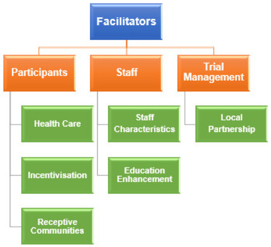 The facilitators included healthcare, incentivisation, and receptive communities (participant level); staff characteristics and education enhancement (staff level); and the local partnership (trial management level) (Figure 4). Illustrative quotes from each sub-theme of the facilitators can be found in Table 4.