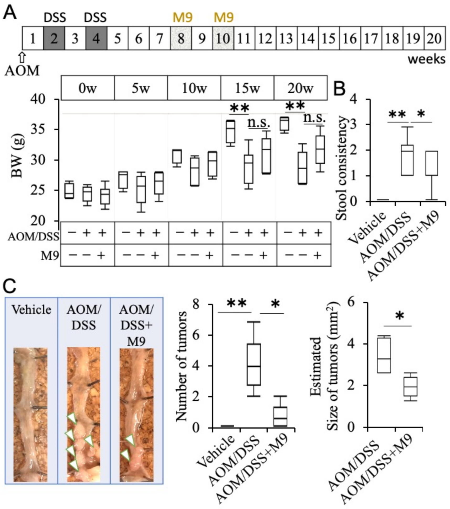 3.1. Probio-M9 Administration Suppresses Inflammatory Carcinogenesis