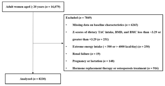 The exclusion criteria for this study were as follows: male sex (n = 17,195); age < 19 years (n = 4479); missing data on bone mineral content (BMC) or BMD (n = 4870); missing data on baseline characteristics (n = 1395); Z-scores of dietary TAC, BMD, and BMC greater than +3.29 or less than −3.29 (n = 251); extreme energy intake (<500 kcal/day or >4000 kcal/day; n = 250); renal failure (n = 19); pregnancy or lactation (n = 148); hormone replacement therapy (n = 684); and osteoporosis treatment (n = 232). A total of 8230 female participants were included in the final analyses.