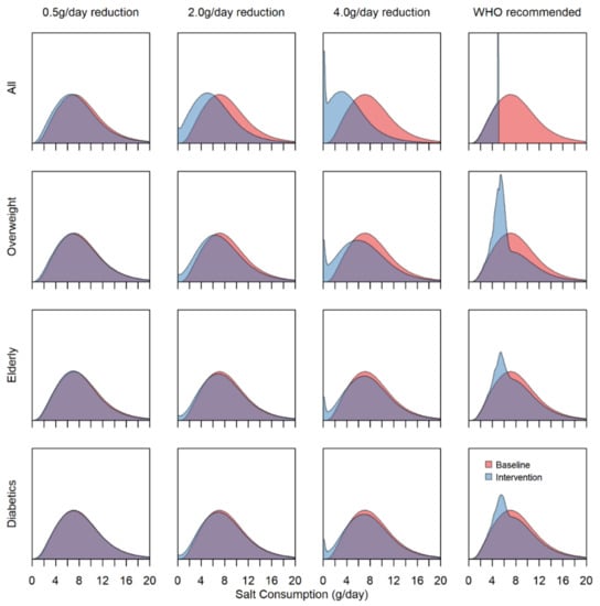 The distribution of salt consumption in the population at the baseline and after the various interventions differs substantially in their efficacy (Figure 1 and Figure S3). Regardless of demographic strata, a 0.5 g/day reduction in salt consumption has a negligible effect on the population, as opposed to the 2.0 and 4.0 g/day reductions, which have visible effects on population salt consumption. At reductions of 2.0 and 4.0 g/day, when restricted to specific high-risk strata, we observed larger decreases to the distribution of ~1.0 and 2.0 g on average for the overweight strata compared with negligible decreases of <0.5 g in the elderly and diabetics. For the WHO recommended intake group of interventions, complete adherence in the entire population will have the largest impact on the salt consumption distribution. Nevertheless, even when targeted at the high-risk strata, there are clear changes in the population salt consumption, with the most prominent change to the distribution appearing in the overweight strata.