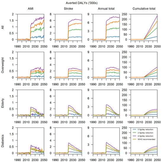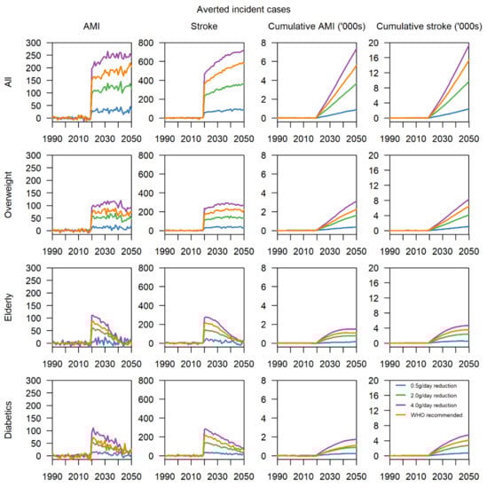 Intervention scenarios involving the elderly did not yield great benefits in averting cases of AMI and stroke over the 30-year period from 2020 to 2050, since individuals in this high-risk stratum may have had long-term high salt intake and consequent organ damage. Regardless, this group should be prioritised as a key target group for salt-reduction interventions through careful management of their daily salt intake, which can effectively reduce their risk of mortality as well as improve their quality of life [,].