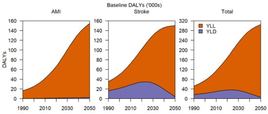 Baseline disability-adjusted life years (DALYs) for AMI and stroke per year, broken down into years of life lost (YLL) and years lost to disability (YLD) from 1990 to 2050.