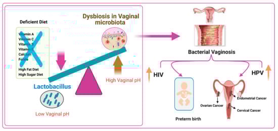 Lactobacillus dominance is that the high starch content of human diets leads to high glycogen levels in the vaginal tract, creating a suitable Lactobacillus environment. Lactobacilli and other fermentative bacteria and vaginal epithelial cells produce lactic acid and are responsible for acidifying the vaginal microenvironment pH to <4.5, which gives the vaginal microbiota a certain level of balance and ability to withstand some infections. This microbiota is shown by a low degree of diversity and the high dynamics of its structure changes under the control of various exogenous and endogenous factors. Nutrients play an important role in altering the vaginal microbiome diversity. A diet deficient in vitamin A, C, D, and E, calcium, folate, and beta-carotene but rich in fats and sugar, causes vaginal infections such as BV, which are linked to preterm birth, increased risk of HIV transmission, increased risk of HPV infection, and cervical, endometrial, and ovarian cancers (Figure 1).