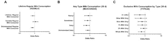 Associations between milk consumption tendencies and reporting current asthma in participants reporting asthma (history or current). Odds ratios for reporting current asthma amongst individuals reporting asthma based on identifying as (A) a lifetime regular milk drinker, or sometimes being a regular milk drinker across life as compared to identifying as never being a regular milk drinker; (B) based on any type of milk consumption tendencies in the previous 30 days; (C) based on regular (5+ days per week) exclusive type of milk consumption.