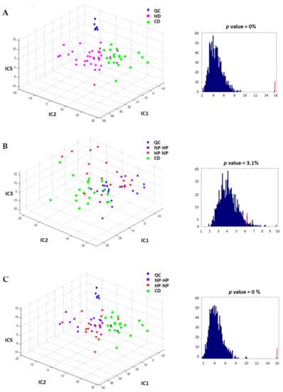 The predictive performance of the IC-DA models was tested by group permutations and comparing the F-distributions of the corresponding Wilks’ lambdas, and the F-values obtained for the true groups was higher than all the F-values calculated for the permuted groups for the first and third models, with empirical p values of 0, thus confirming the validity of these models The IC-DA performed on the data obtained by the HILIC technique also discriminated the HD group from the CD group (Figure 4A). Again, the IC-DA based on intervention (QC, HP-NP, NP-HP, CD) (Figure 4B) did not separate HP-NP from NP-HP, while the IC-DA based on the 3 groups (QC, HP and (CD + NP) allow the separation of the HP group from the CD and NP groups (Figure 4C).