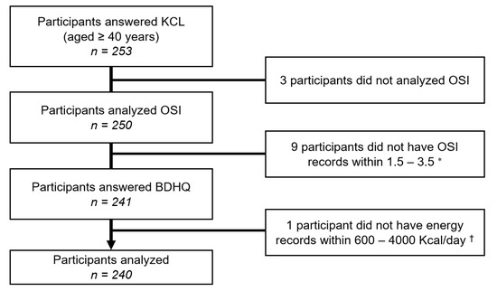 Participant recruitment chart. * This value was set to the OSI mean ± 2SD. † This reference value was chosen for the following reasons: less than 600 kcal/day is equivalent to half the energy intake required for the lowest physical activity category, and more than 4000 kcal/day is equivalent to 1.5 times the energy intake required for the medium physical activity category. Abbreviations: KCL, the Kihon checklist, OSI, the osteo-sono assessment index, BDHQ, the brief-type self-administered diet history questionnaire.