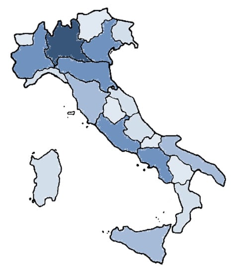 COVID-19 has spread all over the globe. Europe reported more than 28% of global COVID-19 infections, of which, a high number of cases were reported in Italy, especially in Lombardy, Veneto, Piedmont, Emilia Romagna, Campania, and Lazio regions. The percentage of other Italian regions (as of January 2021) did not exceed 6% of cases [4].