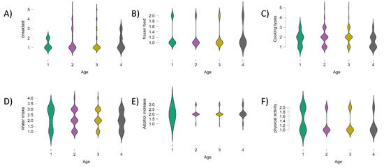 Violin plots created with JASP (www.jasp-stats.org, accessed on 20 January 2021), distinguishing between four different age groups (1 = 0–17; 2 = 18–30; 3 = 31–55; 4 = >55) within (A) breakfast consumption (1 = daily; 2 = often; 3 = sometimes; 4 = rarely; 5 = never); (B) frozen food intake (1 = yes; 2 = no); (C) cooking types (1 = steam; 2 = oven; 3 = griddle; 4 = frying; 5 = microwave); (D) water intake (1 = yes; 2 = no); (E) alcohol increase consumption in respect to pre-Covid-19 period (1 = yes; 2 = no; 3 = no variation); (F) physical activity practice (1 = yes; 2 = no).