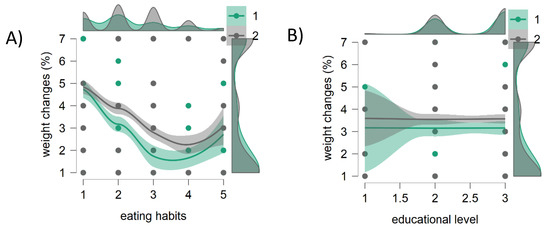 Scatter plots created with JASP (www.jasp-stats.org, accessed on 20 January 2021). (A) The x-axis eating habits, y-axis weight changes (%); (B) x-axis educational level, y-axis weight changes (%). The lines for the relation between eating habits and weight changes (%) are different for female participants (1●), and male participants (2●). The relation between educational level and weight changes (%) is flat for both the genders. Eating habits is for the percentage variation of individual eating habits induced by the lockdown (1 = 0–5%; 2 = 5–20%; 3 = 20–50%; 4) 50–80%; 5 = > 80%); three educational levels were considered (1 = secondary school certificate; 2 = high school diploma; 3 = degree-master-PhD); weight changes were as follows: 1 = ↑1–3 kg; 2 = ↑3–7 kg; 3 = ↑>8 kg; 4 = ↓1–3 kg; 5 = ↓3–5 kg; 6 = ↓>6 kg; 7 = no variation).