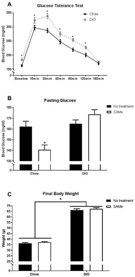 (A). Diet-induced obesity (DIO) mice had significantly impaired glucose regulation following glucose tolerance test (n = 43–53/group). (B). Following six hours of fasting, Chow mice fed SAMe demonstrated improved glucose homeostasis with reduced blood glucose levels relative to all other condition groups (n = 18–25/group). (C). DIO mice weighed significantly more than mice fed a Chow diet, regardless of SAMe treatment. *: Significant difference.