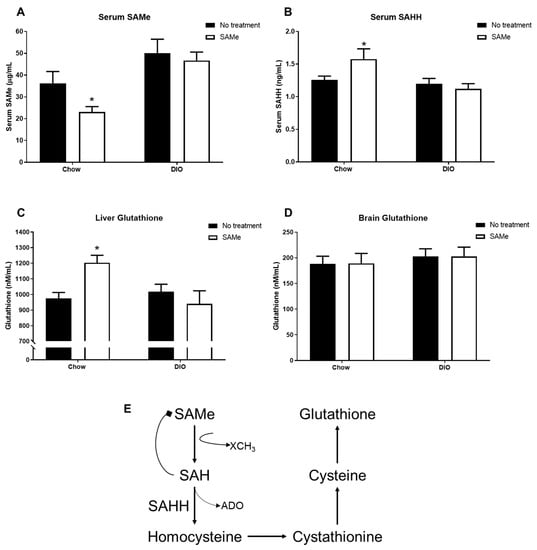 SAMe (A) and (SAHH) (B) were analyzed in serum samples (n = 10/group). Liver (C) and brain (D) were collected for analysis of total glutathione levels (n = 7–8/group). In Chow mice only, SAMe treatment lowered serum SAMe, but increased serum SAH and liver glutathione. (E) Summary of key aspects of the transmethylation and transsulferation pathways that pertain to SAMe, SAHH, and glutathione levels. *: Significant difference.
