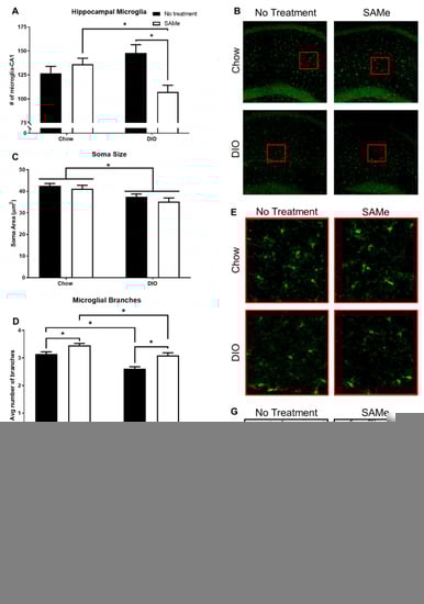 Hippocampal microglia were quantified within the sub-pyramidal area of CA1 for each condition (n = 5–7/group). (A) SAMe treatment in DIO mice significantly reduced microglia density within the CA1, compared to Chow + SAMe and untreated DIO counterparts. (B) Representative confocal images of hippocampal microglia. (C) Somal area of microglia were measured. DIO significantly reduced the cell body size of microglia. (D) Representative confocal images of microglial morphology. (E) Both DIO and SAMe affected the number of microglia branches. (F) Representative high contrast images. (G) Transforming Growth Factor beta 1 (TGFb1) was measured by qPCR (n = 4–5/group) using hippocampal samples. SAMe treatment significantly increased TGFb1 expression in Chow mice. *: Significant difference.