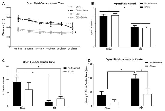 (A) DIO mice placed in the open field were less mobile than their Chow counterparts (n = 12–15/group), there was no effect of SAMe. (B) DIO mice did not move as quickly as Chow mice, SAMe did not affect speed. (C) DIO mice spent a lower percentage of their time in the center of the open field than untreated Chow mice. (D) SAMe treatment improved latency to enter the center area of the open field in DIO mice. *: Significant difference.