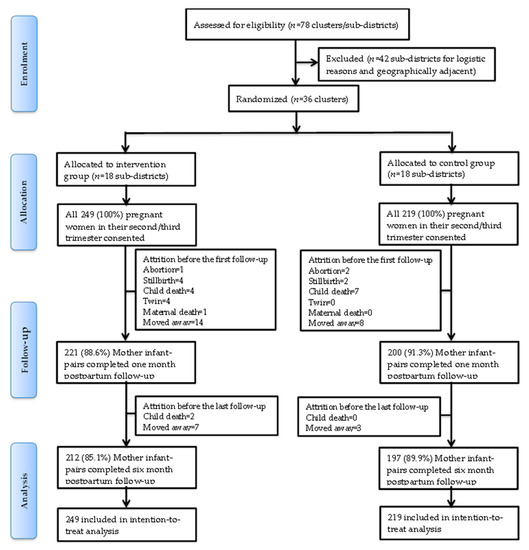 All pregnant women in the selected sub-districts were identified by reviewing the HEWs’ antenatal care logbook. Women in their second or third trimester of pregnancy, who were willing to participate with no intention of leaving the study area during the intervention period, were enrolled for the study between May and September 2017. Study exclusion criteria were the presence of severe mental illness that could interfere with consent and study participation, serious illness or clinical complications warranting hospitalization, the occurrence of maternal death, abortion, stillbirth, infant death, twin gestation, preterm birth (at <37 weeks gestation), or any child congenital malformation that could interfere with breastfeeding.