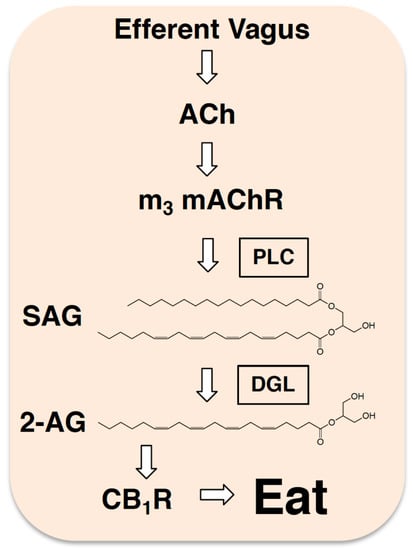 Efferent neurotransmission controls production of 2-AG in the gut. Studies suggest that during a fast, the efferent vagus nerve releases acetylcholine (ACh) into the lining of the small intestine, which in turn, activates local m3-subtype muscarinic acetylcholine receptors (m3 mAChRs) that trigger production of 2-AG (see [24]). This is thought to happen by a mechanism that includes activation of phospholipase C (PLC) and generation of the diacylglycerol 2-AG precursor, 1, stearoyl,2-arachidonoyl-sn-glycerol (SAG). SAG is subsequently hydrolyzed by diacylglycerol lipase (DGL) to ultimately form 2-AG, which activates local CB1Rs and promotes refeeding after a fast in rodents.