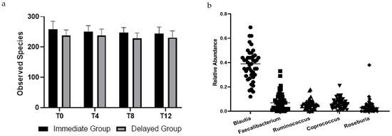 (a) Observed species of bacteria in stool samples collected from participants across all times points. There was no effect of time (p = 0.391) or group × time (p = 0.600). Points are means, and bars represent 95% confidence intervals. (b) Relative abundance of top five genera in stool samples collected at baseline of participants in a randomized controlled crossover high green leafy vegetable dietary intervention.