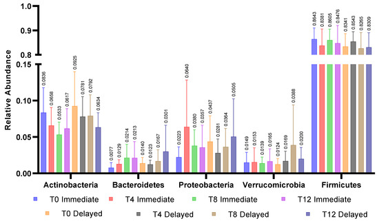 Relative abundance of 5 major phyla within groups across all time points. No significant differences were observed between the immediate and delayed groups within phyla or across timepoints within phyla.