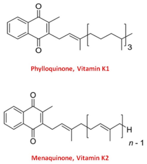 Vitamin K naturally exists in two main forms: Vitamin K1 and Vitamin K2 [37]. Structurally both shared the central 2-methyl-1,4 naphthoquinone ring, named “menadione”, with a side chain on the menadione 3-carbon position [32].