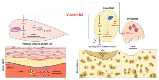 As described in the previous paragraph, the compound members of VitK2 family are specific GGCX cofactors essential for the activation of extra-hepatic VKDPs. Specifically, through the activation of MPG and OC, VitK2 regulates the “calcium paradox” by reducing calcium deposition in the vessel wall and increasing it in the bone tissue, respectively. This results in the promotion of the bone mineralization process and a parallel inhibition of ectopic VC [38].