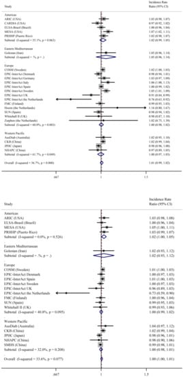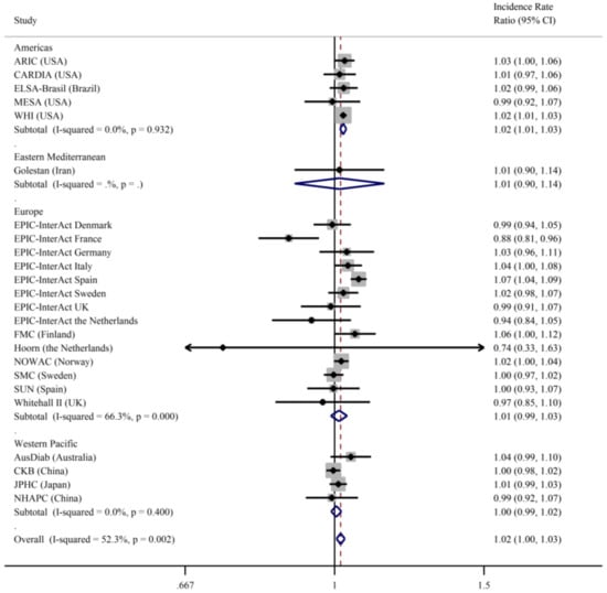 We investigated the effect modification by sex, age, and BMI by including the relevant multiplicative interaction parameter in the models and subsequently combining these parameter estimates across studies. If the combined interaction parameter was statistically significant (p < 0.05), analyses were stratified (for sex and for BMI: BMI < 25 kg/m2 and BMI ≥ 25 kg/m2). Since the heterogeneity of the association between fish intake and type 2 diabetes across different geographical areas was reported in previous meta-analyses [,,,,,,], we further presented the results by the following geographical regions according to WHO classification []: the Americas, including North and South America; Europe; the Eastern Mediterranean; and the Western Pacific, including China, Japan and Australia. There were no studies from the African and South-East Asia Regions. We also tested whether region or age were significant predictors of the association using meta-regression.