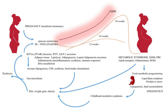 Changes in diet, obesity and excessive weight gain are associated with changes in the gut microbiome. Therefore, bacteria-released lipopolysaccharides and subsequent endotoxemia lead to dysbiosis. The inflammatory process is activated with the release of pro-inflammatory cytokines. Changes in the SCFAs’ synthesis proportions occur. Acetate, absorbed by liver cells, leads to lipogenesis, while stimulating the food intake. In contrast, propionate and butyrate show protective features against diet-induced obesity. Under normal conditions, SCFAs inhibit insulin signaling in adipocytes, reducing fat storage. Energy homeostasis is regulated by FFAR receptors. FFAR-mediated stimulation of GLP-1 and PYY secretion by SCFAs leads to a reduction in insulin secretion. Lipids and carbohydrates stimulate the secretion of PYY, the main factor suppressing appetite after a meal, and GLP-1, which stimulates insulin secretion to prevent peri prandial increases in glycaemia. A maternal high-fat diet, obesity, abnormal SCFAs proportions, hyperglycemia, hyperinsulinemia, IR and hyperlipidemia lead to increased transplacental lipid and glucose transport, triggering inflammatory stress and beta-oxidation in the fetus. As a result, fetal lipogenesis and fat accumulation induce symptoms of metabolic syndrome in neonate.