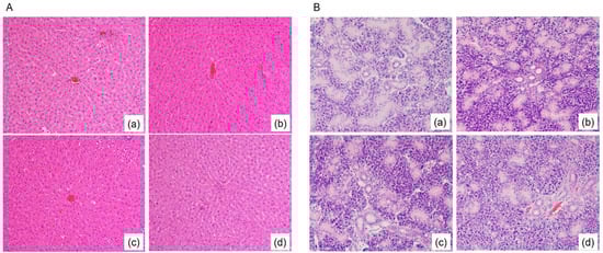 Hematoxylin and eosin staining of liver tissue (A) and submandibular gland (SMG) tissue (B). The rat groups were fed a low-fat fiberless diet (a), low-fat fructo-oligosaccharide diet (b), high-fat fiberless diet (c), or high-fat fructo-oligosaccharide diet (d) for 70 days. Magnification (400×).