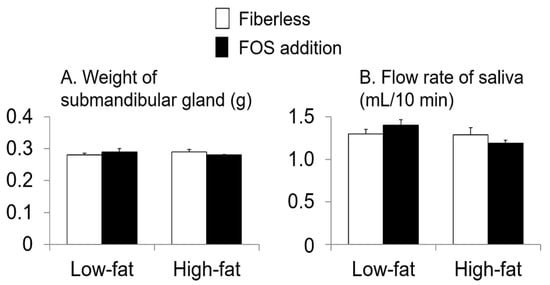 There were no interaction effects observed between fat intake and FOS supplementation or effects of fat intake or FOS supplementation alone on the weight of SMG or flow rate of saliva (interaction: p = 0.08, 0.1, respectively; fat intake: p = 0.8, 0.07, respectively; FOS supplementation: p = 0.7, 1.0, respectively; two-way ANOVA; Figure 2).