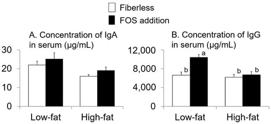 Both fat intake and FOS supplementation affected the concentration of IgG in serum; the IgG concentration in the low-fat with FOS group was higher than that in the other groups. The concentration of IgA in serum was affected by fat intake but not FOS supplementation, and was higher in the low-fat intake group than in the high-fat intake group. Furthermore, a negative correlation was observed between daily fat intake and IgG and IgA concentrations in serum, indicators of systemic immune status []. In our previous study, indigestible dietary fiber intake such as FOS and polydextrose affected the intestinal tract but not the concentration of IgA in serum [,,]; the same result was obtained in this study. However, it has been reported that FOS intake affects systemic immunity; Csernus et al. reported that ingestion of FOS increased the production level of interferon-γ (IFN-γ) in Peyer’s patch cells, increasing the activity of CD4+ T helper cells, and as a result, the concentration of IgG in serum []. Furthermore, FOS intake may have affected serum IgG levels via IFN-γ production in the intestinal tract.